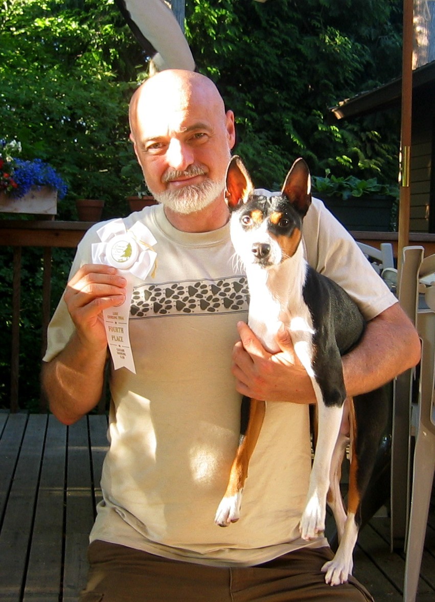 Luxor and his fourth place ribbon. No points, but still a qualifying trial for his A.K.C. Senior Courser (S.C.) title!